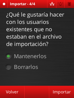- Sobreescribir: el usuario de la importación será registrado y el usuario preexistente será eliminado del sistema. En ese caso, el usuario obtendrá un nuevo ID. Seleccione la opción deseada y presione [SIGUIENTE] para proseguir con la importación.