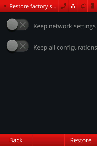 On the Restore configuration screen, you can delete all data on the device and restore the factory settings. To access it, follow the path [MENU] -> [SETTINGS] -> [GENERAL SETTINGS] -> [SYSTEM] -> [RESTORE CONFIG.].